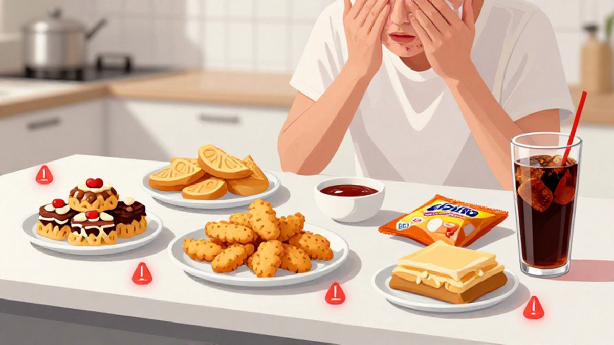 Makanan instan seperti mie instan, nugget, sosis, dan makanan kaleng tinggi garam dapat memperburuk jerawat. Garam berlebih dalam tubuh dapat menyebabkan retensi air dan pembengkakan jaringan kulit, sehingga pori-pori menjadi tersumbat lebih mudah. Selain itu, bahan pengawet dan zat aditif pada makanan olahan dapat memicu reaksi alergi ringan atau inflamasi pada kulit yang memperparah jerawat. Mengutamakan makanan segar, sayuran, buah, dan protein tanpa lemak merupakan langkah efektif untuk menjaga kulit tetap sehat.